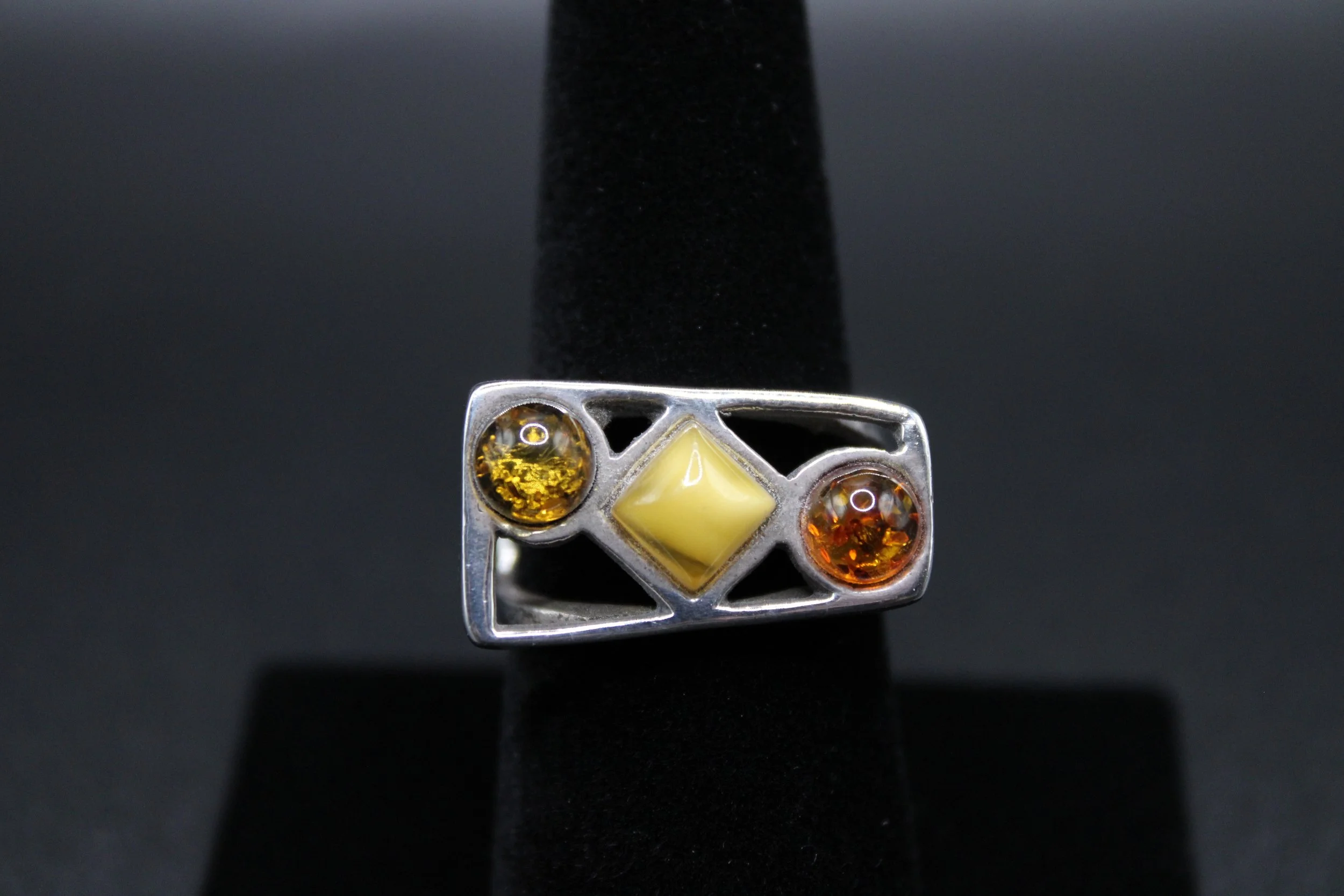 This fierce, handcrafted ring features 3 different types of amber.